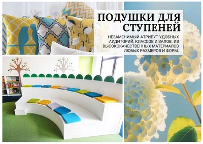 Отличным атрибутом для таких пространств является специальные плоские подушки, которые раскладывают на стубенях для желающих присесть. Они могут быть абсолютно разных форм, размеров, толщины, с креплениями и без.
